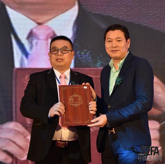 佛山市家具行業(yè)常務(wù)理事長左伯楊為原佛山市家具行業(yè)協(xié)會(huì)常務(wù)副秘書長褚福戰(zhàn)以及家具導(dǎo)刊雜志主編黃科明頒牌