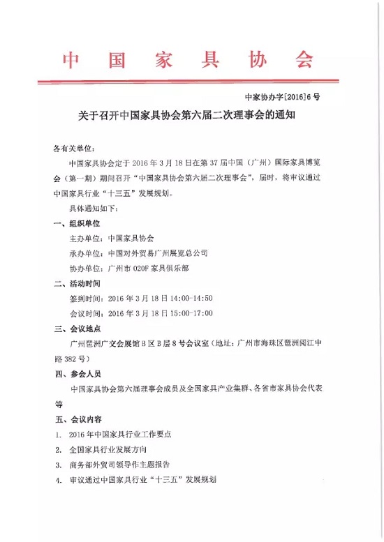 中國家具協(xié)會定于2016年3月18日即第37屆中國(廣州)國際家具博覽會(第一期)期間在廣交會展館8號會議室隆重召開“中國家具協(xié)會第六屆二次理事會”。屆時,會議將審議通過中國家具行業(yè)“十三五”發(fā)展規(guī)劃。中國家具協(xié)會第六屆理事會成員及全國家具產(chǎn)業(yè)集群、各省市家具協(xié)會代表等將出席會議。