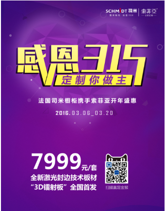 感恩315活動,法國司米櫥柜與索菲亞衣柜為中國消費者一起獻上開年定制大禮。快去天貓搜索“司米櫥柜官方旗艦店”,購買司米3D鐳射板系列櫥柜,讓你的廚房進入干凈、無污時代吧!進入天貓旗艦店:https://simi.tmall.com/