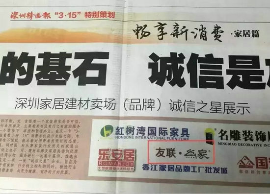 2016年3月初,在深圳經(jīng)濟特區(qū)權(quán)威媒體“深圳特區(qū)報”舉辦的“3.15”特別策劃系列活動中,友聯(lián)為家被評選為“深圳家居建材賣場(品牌)誠信之星”。據(jù)悉,友聯(lián)為家是唯一一個獲得此項榮譽的家具品牌,其他獲得此榮譽的皆為家裝企業(yè)和家居賣場。