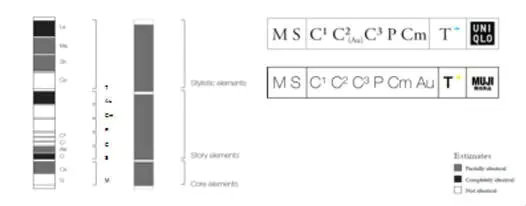 優(yōu)衣庫(kù)(UNIQLO)把服裝詮釋為生活風(fēng)格(Lifestyle)的一種組件,承諾持續(xù)提供時(shí)髦的、高品質(zhì)的、基本的休閑服裝,并在市場(chǎng)上以最低價(jià)格配置。其風(fēng)格元素的配置是:純色、基礎(chǔ)與功能化的形態(tài)、以綿和毛等自然纖維為原料、所用設(shè)計(jì)語(yǔ)言是簡(jiǎn)單直接和中性、調(diào)性是靚麗干凈和輕盈。而無印良品(MUJI)的風(fēng)格元素配置則完全不同,因?yàn)槠淦放苹虿煌?。圖2為優(yōu)衣庫(kù)與無印良品的品牌解碼。