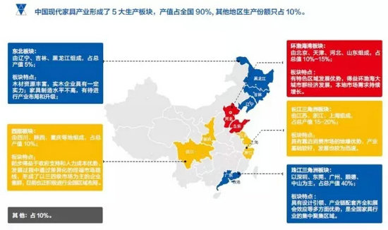 實際上,在中國現(xiàn)代家具產(chǎn)業(yè)5大生產(chǎn)板塊:珠江三角洲板塊、長江三角洲板塊、環(huán)渤海板塊、西部板塊、東北板塊,以深圳、東莞、廣州、順德、中山為主珠江三角洲板塊,占全國總產(chǎn)值40%;以設(shè)計引領(lǐng)、產(chǎn)業(yè)鏈配套齊全和展會效應等多方面優(yōu)勢,是全國家具行業(yè)的集中聚集區(qū)域。