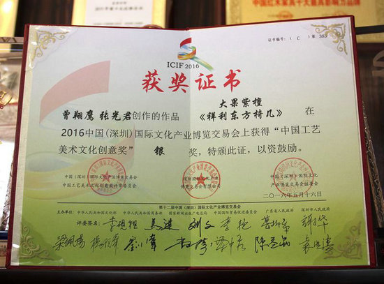 2016第十二屆深圳文博會(huì)“中國工藝美術(shù)文化創(chuàng)意獎(jiǎng)——銀獎(jiǎng)”獎(jiǎng)杯和證書