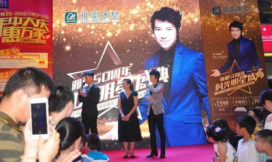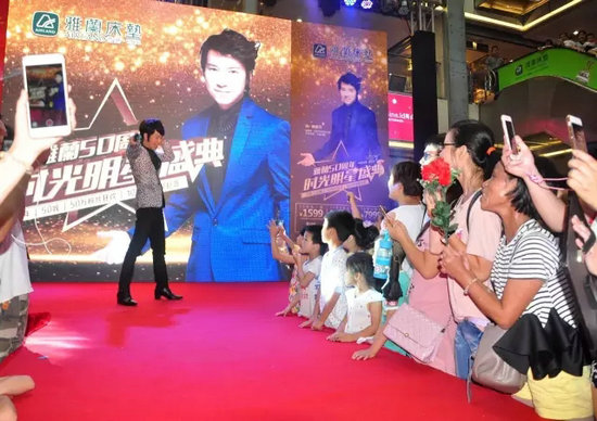 為了回饋忠實(shí)用戶,雅蘭推出50年榮耀款「卡麗蘭」床墊,由邰正宵現(xiàn)場簽售。邰正宵心系粉絲,幽默地向經(jīng)銷商喊話,幫粉絲申請更多優(yōu)惠。經(jīng)銷商爽快答應(yīng),凡是現(xiàn)場購買「卡麗蘭」床墊的客戶均可獲贈(zèng)豪華配套床架。贏得現(xiàn)場歌迷一片歡呼!