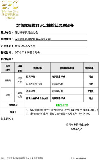 深圳市新福牌家具用品有限公司在持續(xù)的抽檢過程中顯得自信和從容,連續(xù)四個月抽檢合格之后,5月份的原材料抽檢,抽檢合格率依然達(dá)到100%,表現(xiàn)搶眼。