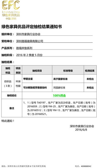 5月的“中國(guó)綠色家具優(yōu)品”抽檢,深圳路福寢具有限公司抽檢合格率再次達(dá)到100%,連續(xù)五個(gè)月抽檢合格,堪稱健康寢具品質(zhì)標(biāo)桿企業(yè)。