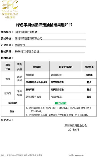 深圳市森堡家俬有限公司,在5月份的“中國綠色家具優(yōu)品”月度抽檢中再傳捷報(bào),涂料和膠粘劑兩項(xiàng)原材料抽檢合格率100%,其中涂料游離甲醛顯示“未檢出”,環(huán)保性能卓越。