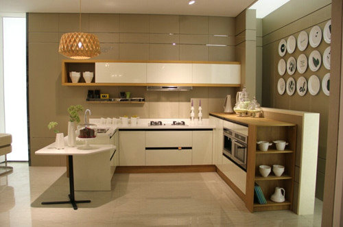 ——廚房柜。中國(guó)現(xiàn)在普遍用的是西方的廚房柜設(shè)計(jì)。這種設(shè)計(jì)都用德國(guó)的32mm系列,說(shuō)是定制,其實(shí)是規(guī)格化的。只是兩邊有收口,柜門(mén)、抽屜頭都是固定的,臺(tái)面用人造大理石、后成型防火板(Post-forming Melamine Sheet),只能說(shuō)不同房型,用不同個(gè)數(shù)的柜子,鋸好臺(tái)面的長(zhǎng)短,然后柜子兩邊收口。