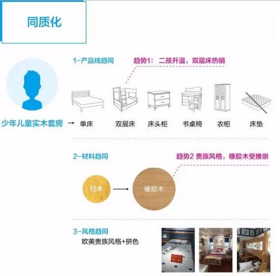 (1)產(chǎn)品線趨同:聚焦少年兒童實(shí)木套房,產(chǎn)品主要鎖定單床、雙層床、床頭柜、書桌椅、衣柜等;