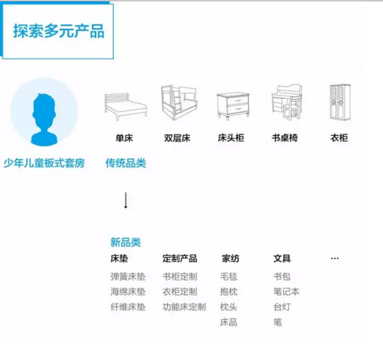 TOMY NIKI 主要產(chǎn)品是少年兒童板式套房,在聚焦傳統(tǒng)品類(單床、雙層床、床頭柜、書桌椅、衣柜)的基礎(chǔ)上,將產(chǎn)品線做了延伸,延伸到床墊(彈簧床墊、海綿床墊、纖維床墊),定制產(chǎn)品(書柜定制、衣柜定制、功能床定制),家紡(毛毯、抱枕、枕頭、床品),文具(書包、筆記本、臺(tái)燈、筆)等等。