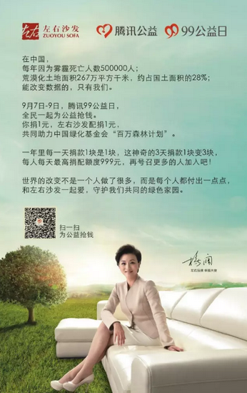隨著全民公益日—99公益日的到來,左右踴躍響應(yīng),一不小心成為首個(gè)助力互聯(lián)網(wǎng)公益事業(yè)的傳統(tǒng)企業(yè),領(lǐng)跑了全行業(yè)。嘴上說得輕巧,但左右沙發(fā)為公益真是操碎了心,不僅發(fā)動(dòng)所有媒體力量號(hào)召全民為綠色行動(dòng)起來,而且和騰訊聯(lián)手承諾:你捐一塊,我們聯(lián)合捐助兩塊,一起為防沙漠化建設(shè)添磚加瓦。