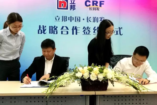(立邦中國區(qū)總裁鐘中林(左)與長潤發(fā)涂料董事長王文彬(右)簽訂戰(zhàn)略合作協(xié)議)