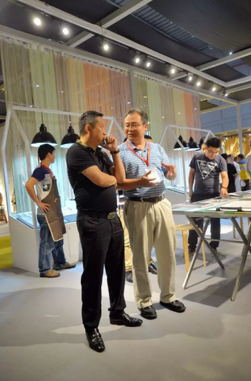 榮麟家居董事長戚麟(左)與威士伯工業(yè)木器漆亞洲區(qū)董事總經(jīng)理于讓波(右)交流
