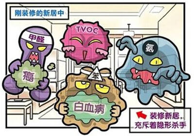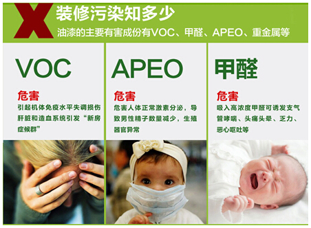 復旦大學女博士于娟因患乳腺癌去世,其中一個重要原因就是家里所使用的家具甲醛嚴重超標。年僅8歲的“福娃”鄧鳴賀因白血病因不治去世,也是因為家里幾次搬家裝修。為什么裝修的危害會這么大呢?其實,家庭裝修的主要致病源是來自家具、墻料涂漆等散發(fā)出來的甲醛和含重金屬的化學毒氣,尤其像墻料涂漆這種大面積的家裝材料,如果用錯,你的家瞬間就能變成一個毒氣實驗室。