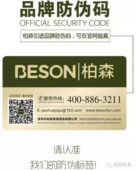 柏森家具啟用產(chǎn)品二維碼身份識別系統(tǒng)給工廠生產(chǎn)的正品以強有力的保障。凡是我司生產(chǎn)的家具,每一件產(chǎn)品上都貼有一個“二維碼身份證”,消費者只需用手機掃描或者登錄我們企業(yè)的官網(wǎng)(www.besonfur.com)就可查詢真?zhèn)巍OM者在查詢真?zhèn)蔚耐瑫r,還可以享受柏森家具送出的產(chǎn)品售后服務(wù)。