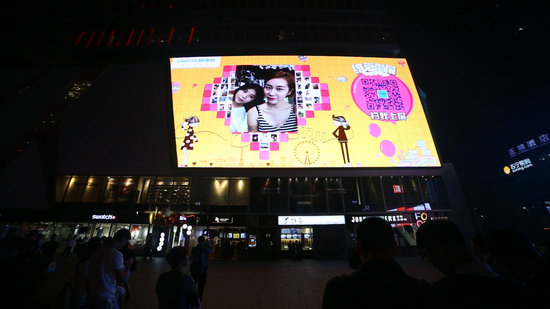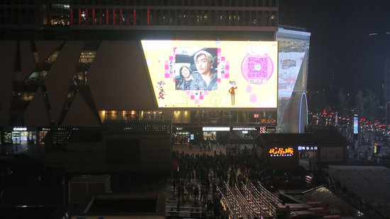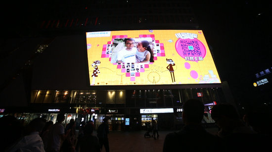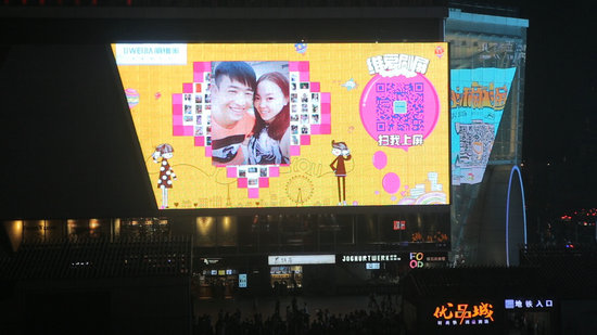 晚上8點(diǎn)左右,伴著《Sugar》的“甜蜜快閃”,舞者們向路人派發(fā)傳單,通過掃描二維碼,路人們紛紛進(jìn)入“維愛刷屏”互動(dòng),無數(shù)情侶、夫妻的親密合照,迅速登陸春熙路兩塊戶外大屏,開始填充屏幕中的愛心,一發(fā)不可收拾。