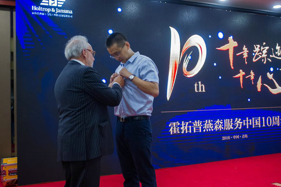 霍拓普-燕森公司董事長Lindemann先生親臨活動(dòng)現(xiàn)場,發(fā)表了飽含深情的致辭。Lindemann先生對中國文化和歷史都非常喜歡,對中國市場未來發(fā)展非??春?,并對霍拓普-燕森在中國市場的開拓寄予厚望。Lindemann先生還回顧了與霍拓普燕森(青島)公司總經(jīng)理閆方先生的結(jié)識淵源,對閆方先生這十年來推動(dòng)公司發(fā)展所做的貢獻(xiàn)表示感激,稱贊閆方作為一個(gè)企業(yè)帶頭人表現(xiàn)出了卓越的才能和高尚的品質(zhì)。十年攜手發(fā)展歷程,情感積淀下深厚友誼,Lindemann先生視閆方如同自己的兒子般親近,在國內(nèi)外商業(yè)合作史上,于今日成一段佳話。