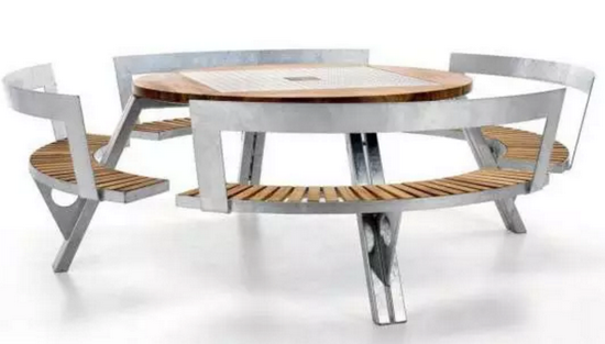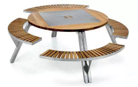 材料的使用也極為科學(xué)、合理,承重構(gòu)件用鍍鋅金屬,而與人體直接接觸處采用不那么堅(jiān)硬和冰冷的實(shí)木,實(shí)木使用極為節(jié)制,用到了刀刃上。坐面間隙式條狀構(gòu)件不僅有效節(jié)約了木材,又避免了濕脹干縮后可能產(chǎn)生的質(zhì)量問(wèn)題;桌面上的木構(gòu)件部分由于采用的是開(kāi)放式構(gòu)件,因此,盡管戶(hù)外環(huán)境復(fù)雜,但也不會(huì)因木材變形而破壞桌子結(jié)構(gòu)。