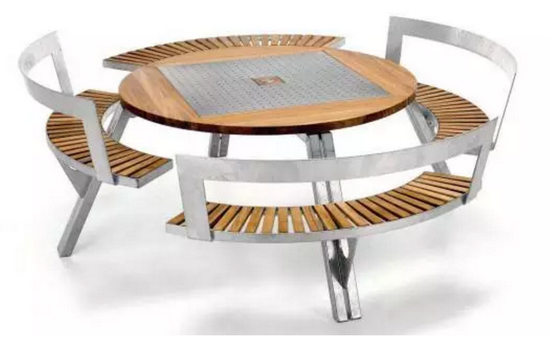 它由鍍鋅金屬(長(zhǎng)椅的支架結(jié)構(gòu)和框架),不銹鋼(桌面中央)和柚木制成。這些材料的綜合使用,使得造型設(shè)計(jì)、功能、舒適性和品質(zhì)達(dá)到完美的平衡。