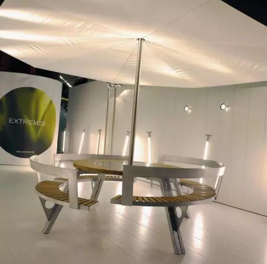 還有一頂遮陽(yáng)傘是補(bǔ)充到Gargantua上去的,提供陰涼的面積有4M的直徑。八角型的陽(yáng)傘有著獨(dú)特的構(gòu)造,坐在傘下除了白色的純凈布料外,看不到煩人的筋骨。材料是專(zhuān)供戶(hù)外用的耐久物:鋁的傘骨、不銹鋼的傘桿和基座,自然面料是耐日光的,開(kāi)閉自如。
