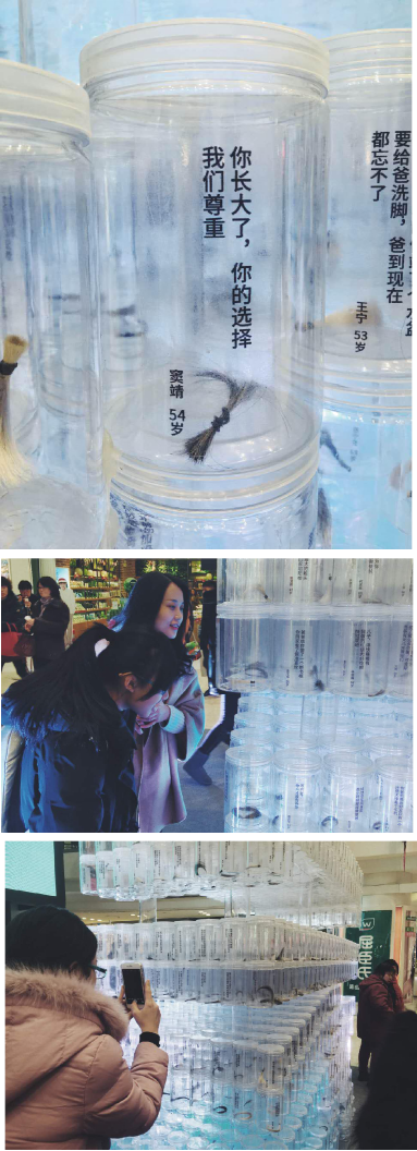 2061 個裝有白頭發(fā)的瓶子組成,整體呈現(xiàn)出一個巨型的立體“家”字,孤獨(dú)地聳立在商場地面上,吸引了不少路人停駐觀看。