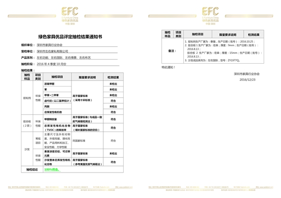 12月23日,中國綠色家具優(yōu)品2016年四季度10月份抽檢工作完成,作為首批獲證企業(yè),也是優(yōu)品項目典范企業(yè),左右家私以100%合格率順利通過新一輪的質量抽檢,繼續(xù)保持企業(yè)對于品質的專心和用心。