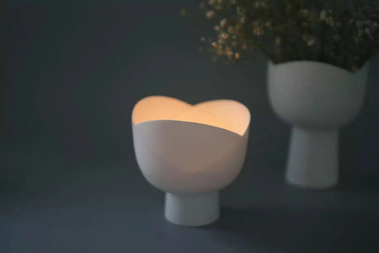 旻佳特別欣賞墨西哥舞娘裙擺舞動(dòng)的美態(tài),她用一種注漿的方式把這種美傳遞到了陶瓷上,燒制而成“舞動(dòng)的燈”。