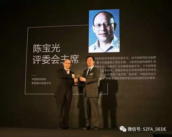 ▲深圳家具研究開發(fā)院許柏鳴院長為第2屆金汐獎評委會主席陳寶光先生頒獎