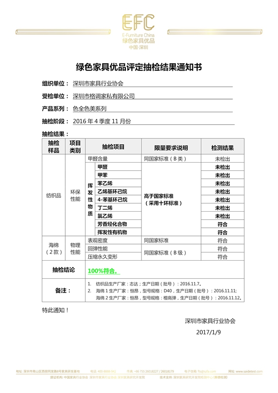 中國(guó)綠色家具優(yōu)品工作啟動(dòng)以來,抽檢工作在深圳家具研究開發(fā)院檢測(cè)中心(賽德檢測(cè))主導(dǎo)下有條不紊的進(jìn)行。2017年初,2016年4季度11月份的抽檢工作圓滿完成,深圳市格調(diào)家私有限公司色全色美系列抽檢結(jié)果100%符合。