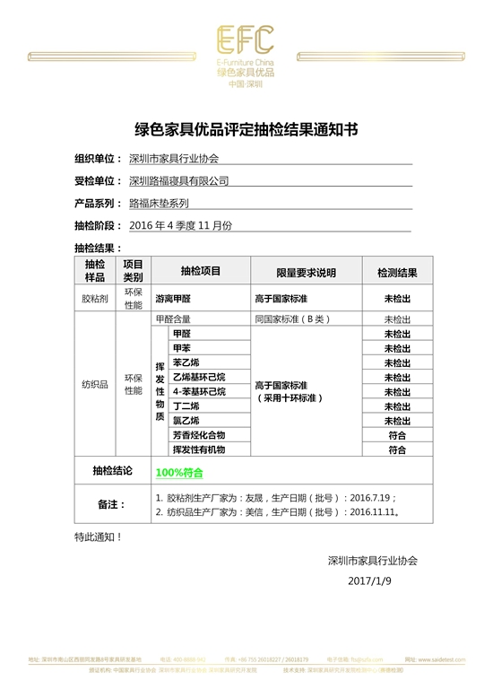 中國(guó)綠色家具優(yōu)品工作啟動(dòng)以來(lái),抽檢工作在深圳家具研究開(kāi)發(fā)院檢測(cè)中心(賽德檢測(cè))主導(dǎo)下有條不紊的進(jìn)行。2017年初,2016年4季度11月份的抽檢工作圓滿(mǎn)完成,深圳路福寢具有限公司路福床墊系列抽檢結(jié)果100%符合。