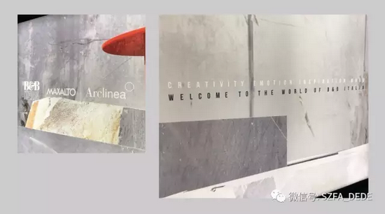 B&B ITALIA作為國際頂級家具品牌,在米蘭展上常常撲朔迷離(通常只展示戶外部分),這次我們竟在科隆戰(zhàn)場上與它不期而遇了。這張B&B ITALIA外墻面海報上寫著兩行字:Creativity Emotion Inspiration Mood,Welcome To The World Of B&B ITALIA。意為:創(chuàng)造、感動、啟迪、情緒,歡迎來到B&B ITALIA的世界。此外,左圖三個LOGO依次為B&B ITALIA母品牌,MAXALTO子品牌,及合作廚房家具品牌Arclinea。