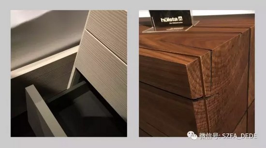 再如:從優(yōu)適德Hülsta推層出新的飾面效果又能管中窺豹。左圖,沙灘色的飾面和淺淺的痕跡讓人如赤腳般走在沙灘上般放松;右圖,跨越三個面、用整塊胡桃木紋留下深色刮痕的做法,極其逼真地模擬了實(shí)木,可謂把人造板家具推向新的高峰。