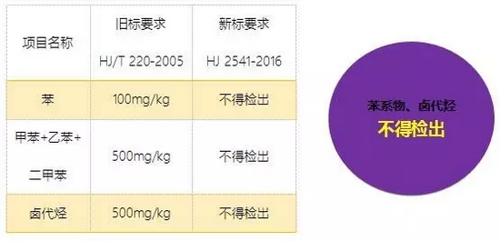 新標(biāo)準(zhǔn)中,除了游離甲醛、鹵代烴、乙二醇醚及其酯類的總量、可溶性重金屬維持原有的高限量要求以外,在關(guān)鍵項(xiàng)目的TVOC和苯系物進(jìn)行了大幅度的提升。
