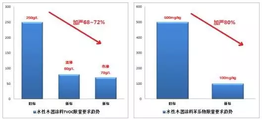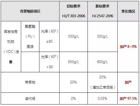 溶劑型木器涂料作為高揮發(fā)性溶劑,新標(biāo)準(zhǔn)在舊標(biāo)準(zhǔn)的基礎(chǔ)上又進(jìn)行了提升: