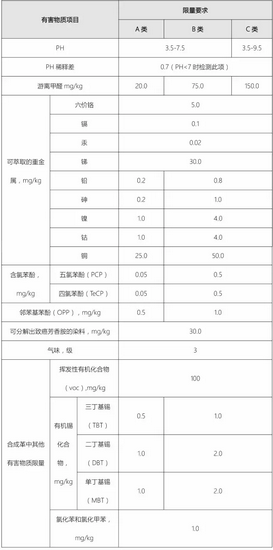 新標(biāo)準(zhǔn)增加了對皮革和人造革的要求,具體限量要求如下:
