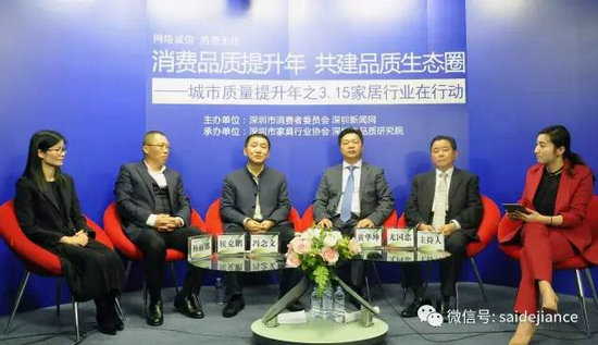 3月13日下午,深圳市消費者委員會秘書長馮念文、深圳市家具行業(yè)協(xié)會會長黃華坤、市家具行業(yè)協(xié)會執(zhí)行會長侯克鵬、深圳市家具行業(yè)協(xié)會執(zhí)行會長尤國忠以及深圳家具研究開發(fā)院檢測中心(賽德檢測)主任楊麗娜,一同來到深圳新聞網演播室,共同參與“城市質量提升年之3.15家具行業(yè)在行動”座談會,探討在家具行業(yè)內,企業(yè)如何提升產品品質、服務質量,更好的保障消費者權益,建設放心無憂的消費環(huán)境。