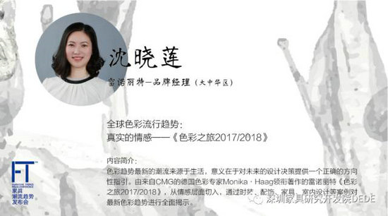 今年,研發(fā)院首次特邀全球色彩潮流趨勢專業(yè)領(lǐng)域權(quán)威,“德硅·雷諾麗特”大中華區(qū)品牌經(jīng)理沈曉蓮女士為深圳首發(fā)站帶來《全球色彩流行趨勢:真實(shí)的情感——色彩之旅2017-2018》。相信2017FT發(fā)布會(huì)·深圳站將是潮流研究和應(yīng)用的一場盛宴。