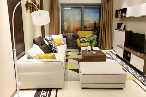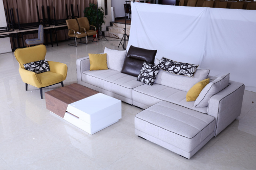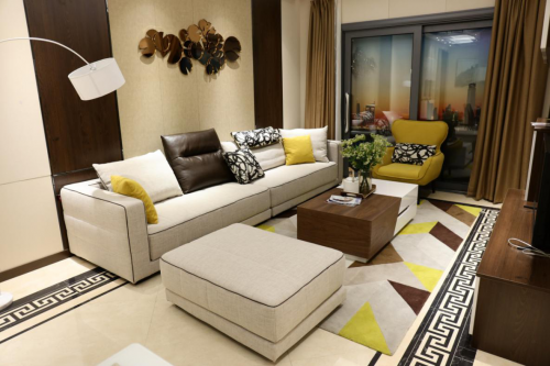 布拉格_SP-B1703A布藝沙發(fā)外形簡約大氣,優(yōu)雅的時尚灰,搭配褐色靠枕、黃色和抽象線條抱枕點綴其中,透著一股現(xiàn)代溫馨的氣息,恰到好處地彰顯出主人不凡的生活品味。