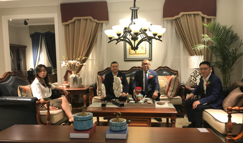 洛曼家居李國(guó)慶董事長(zhǎng)(左2)、詩(shī)海康營(yíng)銷策劃的董事長(zhǎng)吳永康(左3)洛曼家居營(yíng)銷副總李宗君(右1)
