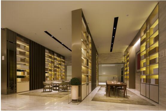 在大堂休息區(qū)的書墻,燈光對空間妙用更是表現(xiàn)無疑:挑高4.3米的書墻由金屬材質(zhì)構(gòu)成,隔板下的燈帶不僅將書墻打照更為立體與洗練,更巧妙地形成光的分隔,流動為一室,分隔則為空間。