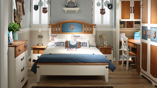 普羅城堡【BOBO】作為青少年兒童家居品牌,不斷創(chuàng)新和嘗試,開創(chuàng)了將天然的木材、原始的皮革、古銅色的金屬、豐富的色彩和神秘的圖案完美的融合在一起的先河。皮革和金屬出現在兒童家具上,這在行業(yè)內是獨一無二的。以鉚釘的形式將金屬貼合在床腳上,或者以環(huán)扣的形式與皮帶一起附在床屏上,不僅增加了兒童家具輕復古的高端經典感,也讓孩子的世界除了多彩歡快之外,更增添了故事性和智慧啟發(fā)的特點。