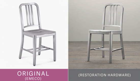 在美國,Eames沙發(fā)椅和其他著名設(shè)計(jì)作品受到“商業(yè)外觀權(quán)”的保護(hù),保護(hù)家具的來源標(biāo)識功能。這項(xiàng)法律保護(hù)著名的設(shè)計(jì)作品(比如Eames的沙發(fā)椅、可口可樂瓶等)的“商業(yè)外觀”(不論該設(shè)計(jì)專利是否過期)。 很少有公司能復(fù)制別人的設(shè)計(jì)。但在2012年,美國高檔家具公司Restoration Hardware(以“借用他人的設(shè)計(jì)”聞名),推出一款名為“Naval”的椅子,與賓夕法尼亞州椅子制造商Emeco的著名設(shè)計(jì)“Navy”椅一模一樣。