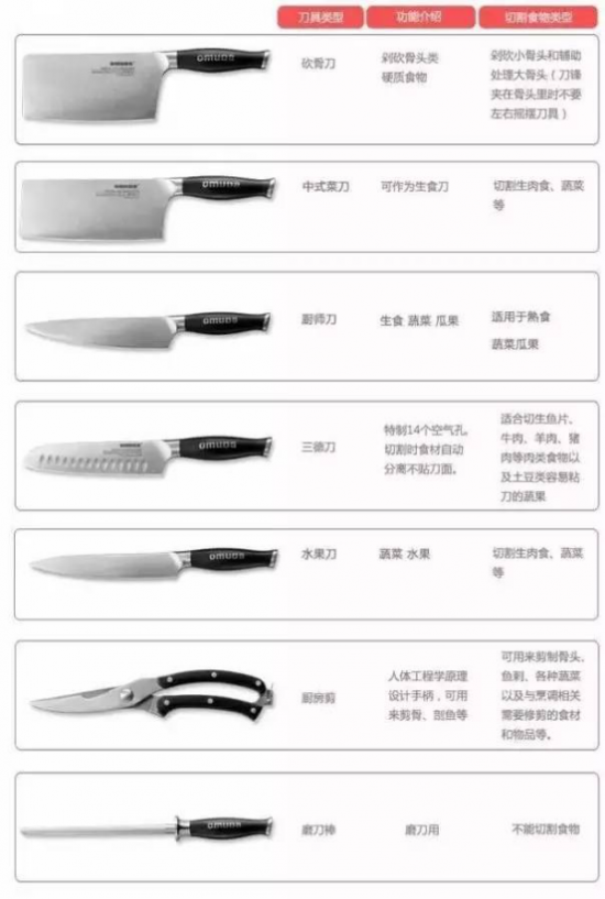 如果是注重生活品質(zhì),特別是喜歡烹飪西餐的消費(fèi)者,經(jīng)常會(huì)使用到砍骨刀、中式菜刀、廚師刀、三德刀、水果刀、磨刀棒、廚房剪等刀具。可以說,選擇一把合適的刀具,知曉一些辨別刀具的方法,能為精致的廚房生活錦上添花。