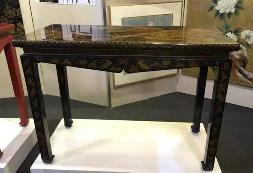 廈門市鴻風(fēng)堂藝術(shù)品有限公司 手繪畫天然漆十八世紀(jì)最具中國藝術(shù)風(fēng)格描金八寶吉祥紋開光細(xì)密山水圖琴桌作品