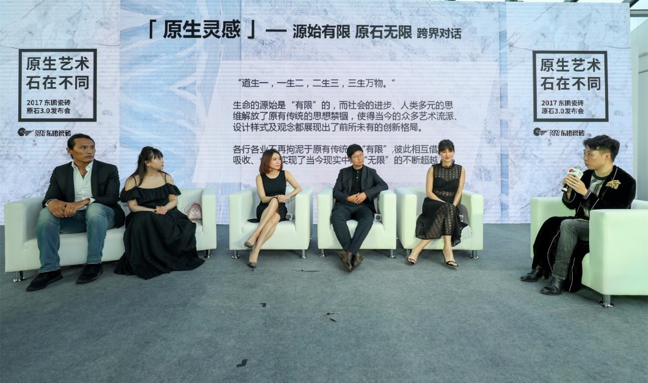 不僅如此,現(xiàn)場更是進行了一場關(guān)于“源始有限 原石無限”的跨界對話,建筑設(shè)計師張海翱、時尚Icon陳燃、時尚評論人周睿、知名珠寶設(shè)計師童文威、新銳時尚攝影師孫瑞祥、東鵬瓷磚戰(zhàn)略與品牌系統(tǒng)總經(jīng)理何穎共同在“無限”上大開腦洞,分享了在各自領(lǐng)域的獨到觀點,探討心目中科技與藝術(shù)結(jié)合的理想生活。