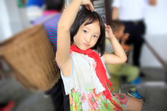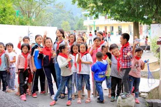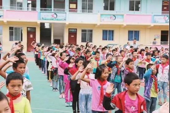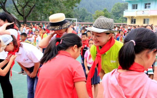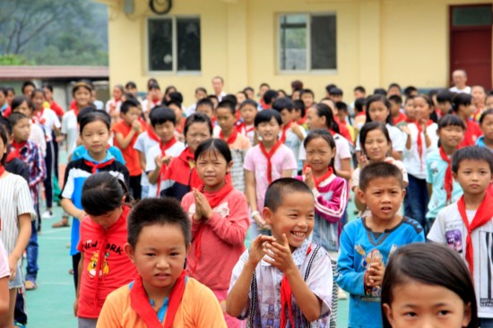 令人感動的是,溫泉鎮(zhèn)中心學(xué)校的余恩學(xué)校長知道我們要來,推掉原計劃的會議,早早的在去小學(xué)的必經(jīng)路上等我們。到達學(xué)校時,師生早已在操場上整齊排列,等待我們的到來。