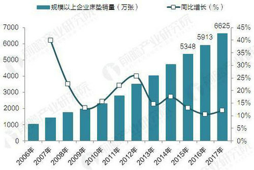 另?yè)?jù)前瞻產(chǎn)業(yè)研究院發(fā)布的《2017-2022年中國(guó)床墊行業(yè)市場(chǎng)前瞻與投資戰(zhàn)略規(guī)劃分析報(bào)告》統(tǒng)計(jì),我國(guó)規(guī)模以上企業(yè)床墊銷量呈快速增長(zhǎng)趨勢(shì),尤其是2007年增速高達(dá)39%,2009年以來年均增速保持在18%以上,2016年規(guī)模以上企業(yè)共銷售床墊5913萬(wàn)張。