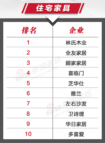 住宅家具類排行:第一,林氏木業(yè);第二,全友家居;第三,顧家家居;第四,喜臨門;第五,芝華仕;第六,雅蘭;第七,左右沙發(fā);第八,衛(wèi)詩理;第九,華日家居;第十,多喜愛。