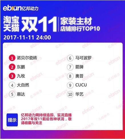 11月11日0:22:37諾貝爾突破7500萬,登上天貓家裝主材第一的位置;0:37:33總銷售額率先突破1億;2:46:31打破2016年“雙十一”總銷售額,繼續(xù)領(lǐng)跑家裝主材類目;11點(diǎn)諾貝爾瓷磚代表家裝主材類目,率先突破3億歷史大關(guān);15:30總銷售額突破3.5億;21:43諾貝爾瓷磚成功進(jìn)入“雙十一”4億俱樂部;23:59:59 屬于諾貝爾瓷磚的數(shù)據(jù)最終定格在4.6億,傲居天貓家裝主材類目銷量第一名。