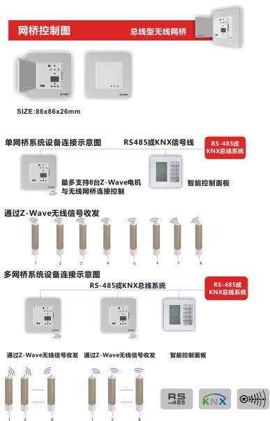 RS-485/KNX轉(zhuǎn)Z-Wave無線網(wǎng)橋,可同時控制8個Z-Wave協(xié)議窗簾電機(jī);網(wǎng)橋連接的8臺電機(jī)可獨(dú)立設(shè)置ID地址,具備獨(dú)立控制、群控功能。外接RS485/KNX總線系統(tǒng),可對電機(jī)分組、群控、場景控制,實(shí)現(xiàn)智能控制功能。網(wǎng)橋功耗低、抗干擾能力強(qiáng),可吸頂安裝、墻控8盒安裝,操作靈活簡易。